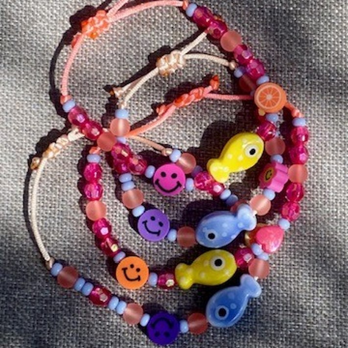Add some fun met deze kleurrijke armband met een visje, smiley en bloemetje. Deze armband is geregen satijndraad en met een schuifknoop verstelbaar. De armband is ontworpen en gemaakt door Club Étoile.