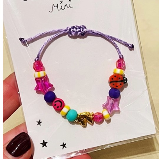 Add some fun met deze kleurrijke armband met een met een unicorn, smiley, lieveheerbeestje en sterrertjes. Deze armband is geregen op satijndraad en met een schuifknoop verstelbaar, waardoor een kind hem gemakkelijk zelf om of af kunt doen en er ook geen gevaar is als de armband ergens achter blijft haken.