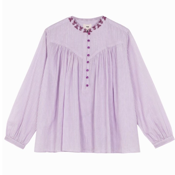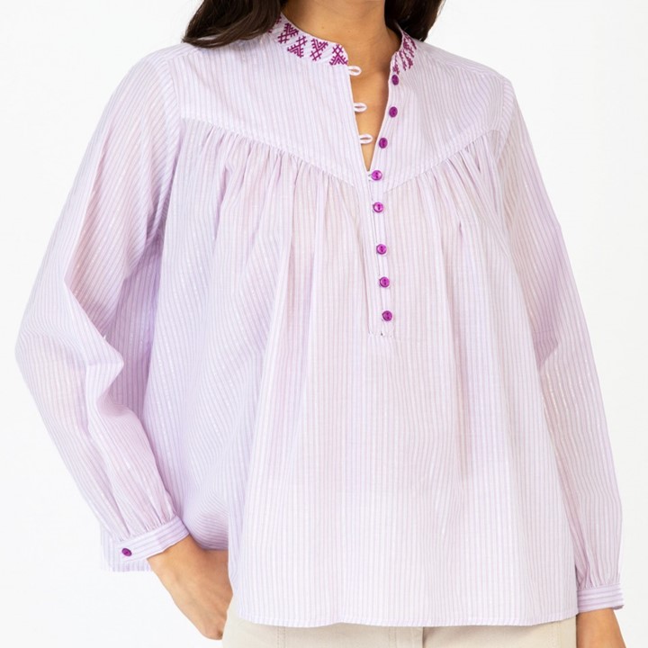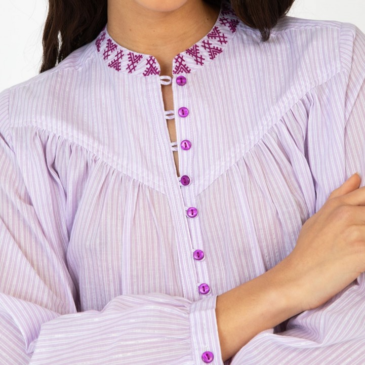 Luchtige, wijde blouse van katoen met streepjes van lila en zilveren lurex garen en prachtige borduren langs de kraag.