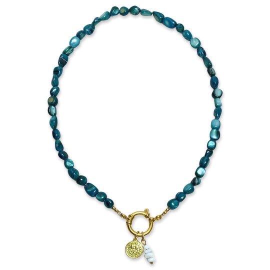 Prachtige ketting van natuurstenen kralen in warme kleuren met een gouden sluiting en 2 bedels. Deze donker groene versie heeft een smiley bedel ingelegd met kleine steentjes en een witte natuurstenen kralen bedel. De ketting is 42 cm lang.