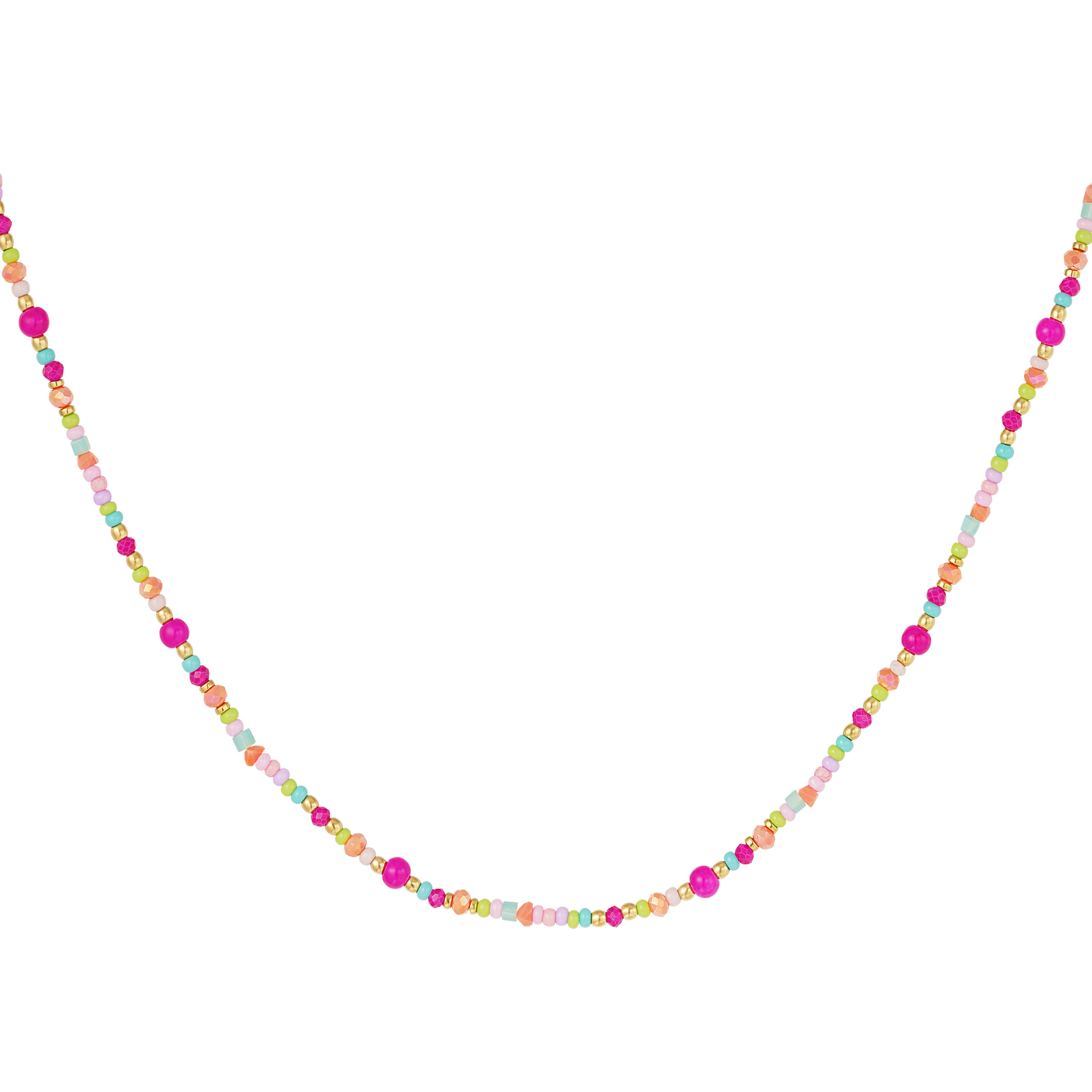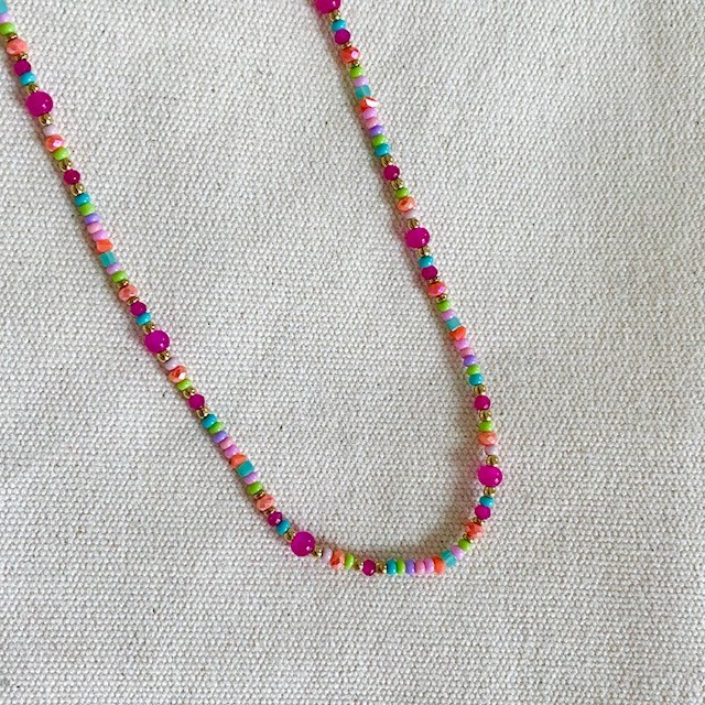 Hoe vrolijk is deze gekleurde kralen ketting! Hij is mooi fijntjes en is gemaakt van een combinatie van glazen-, kristal-, hermatiet- & shelp kralen en gouden gecoate metalen kralen. De ketting is 37 cm lang en nog eens 5 cm verstelbaar.