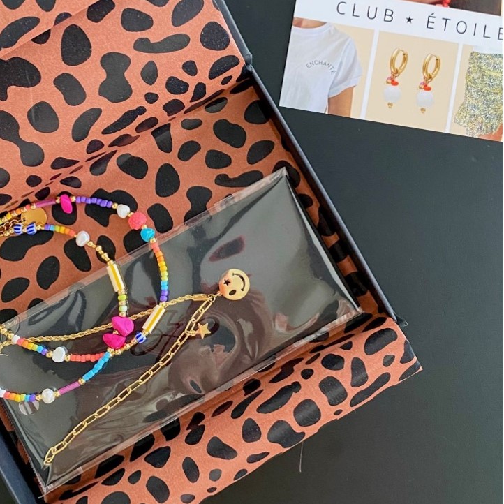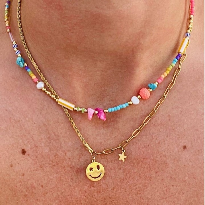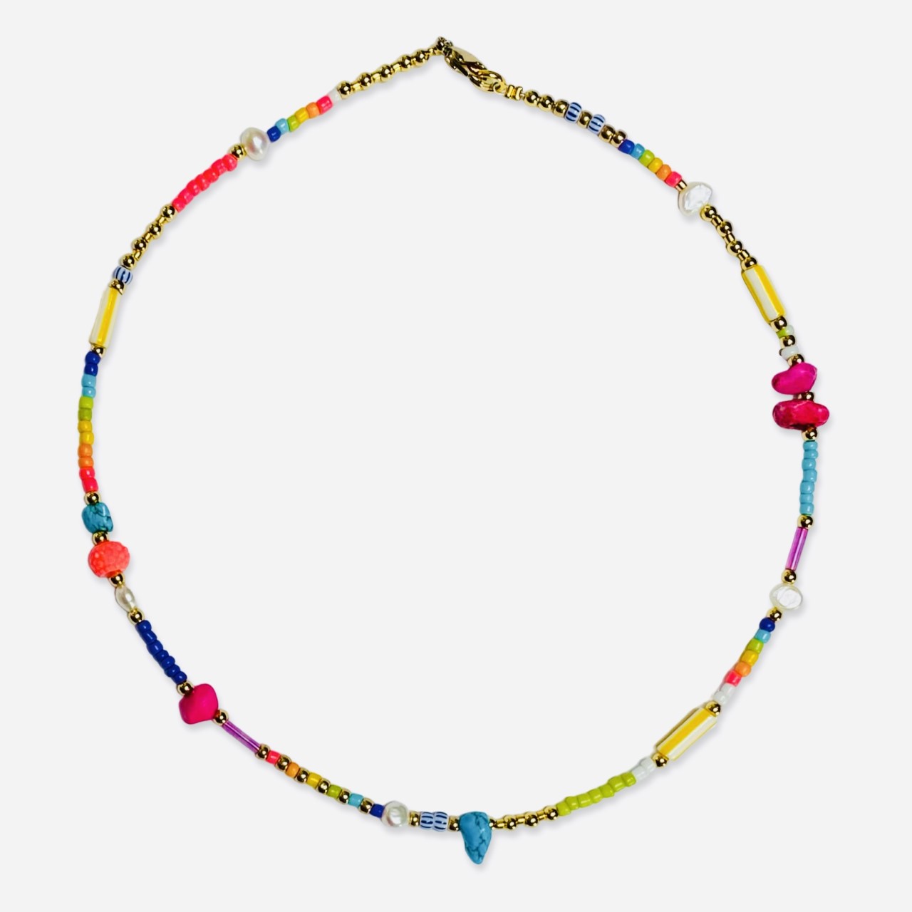 Korte choker ketting met een kleurrijke mix van verschillende soorten kralen, zoetwaterparels en natuursteen met gouden accenten van stainless steel. Deze ketting is ontworpen en gemaakt door Club Étoile.