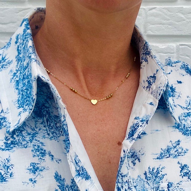 Prachtige fijne schakelketting met bolletjes en hartje in het midden. De ketting is gemaakt van stainless steel, gold plated. De ketting is 38 cm lang en nog eens 5 cm verstelbaar.