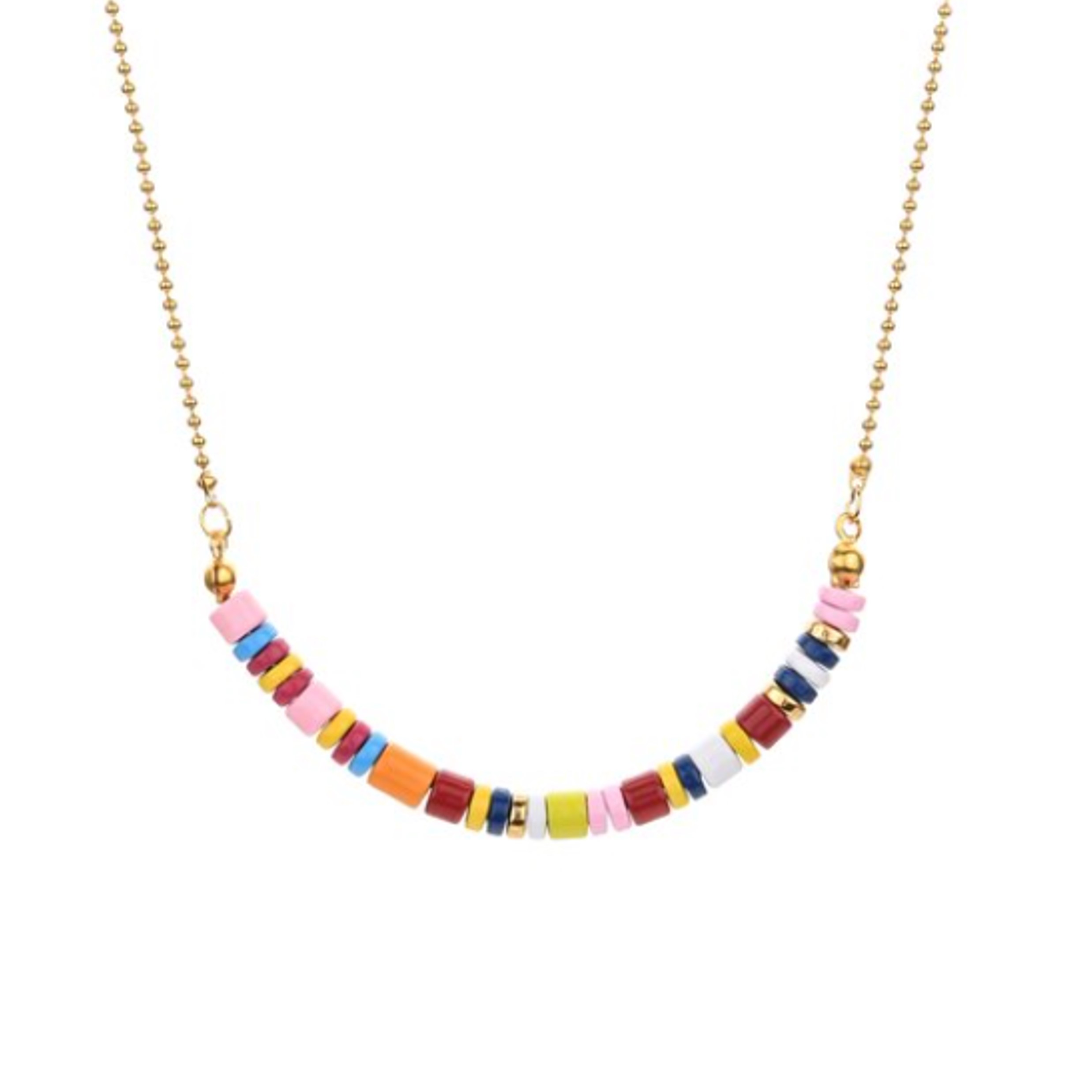 Lange gouden bolletjes ketting van RVS met in het midden een selectie van ronde metalen kralen in prachtige herfst kleuren.