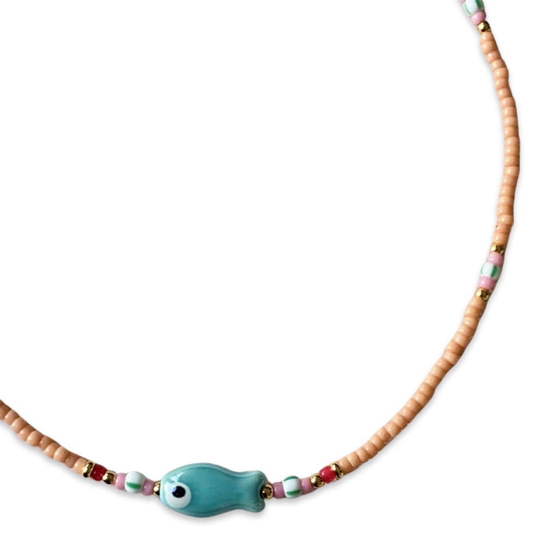 Korte ketting van gekleurde kralen met een grote vis kraal en gouden accenten die elke outfit opfleurt! Deze ketting is ontworpen en gemaakt door Club Étoile.