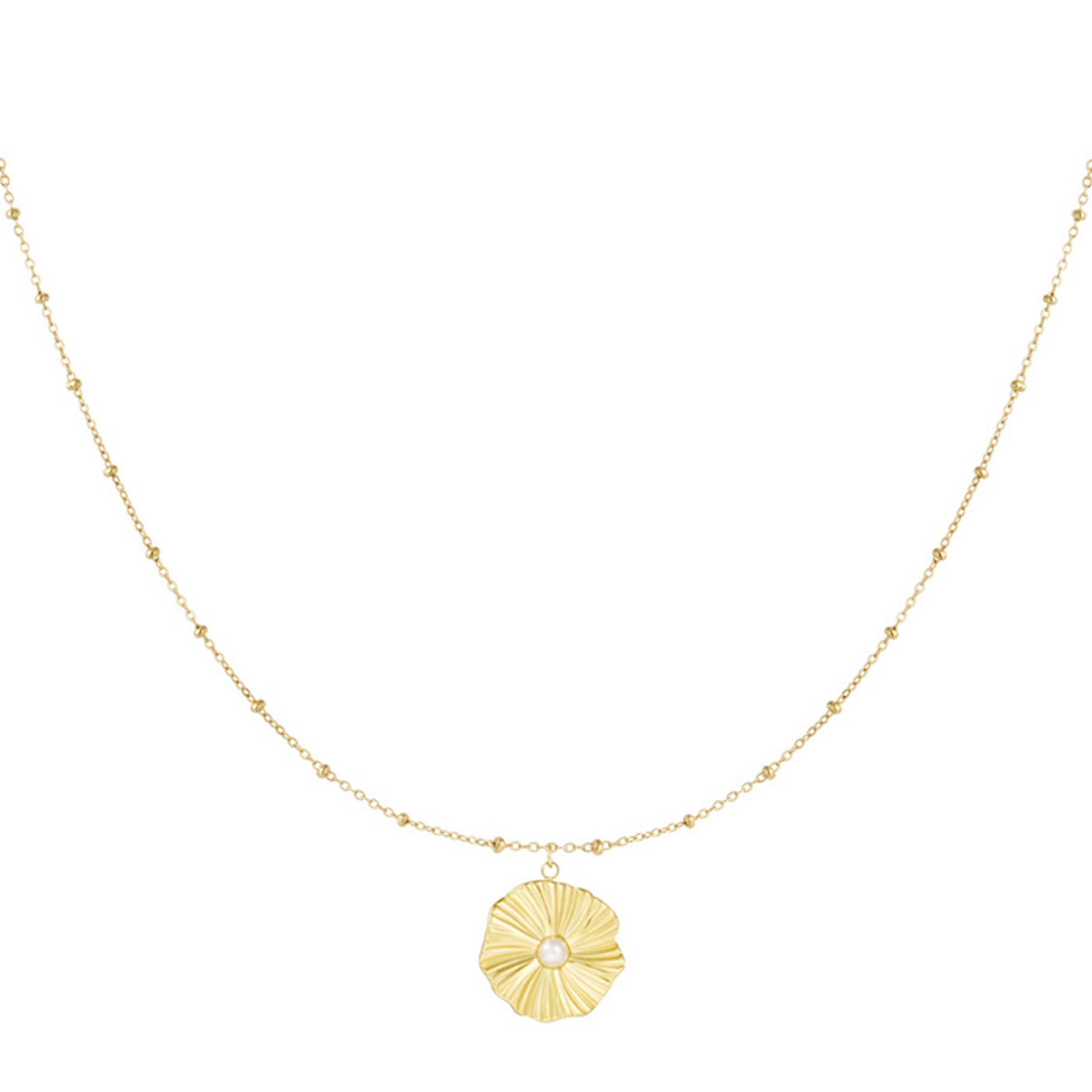 Dunne gouden ketting met bolletjes van stainless steel met gestreepte ronde bedel met pareltje.
