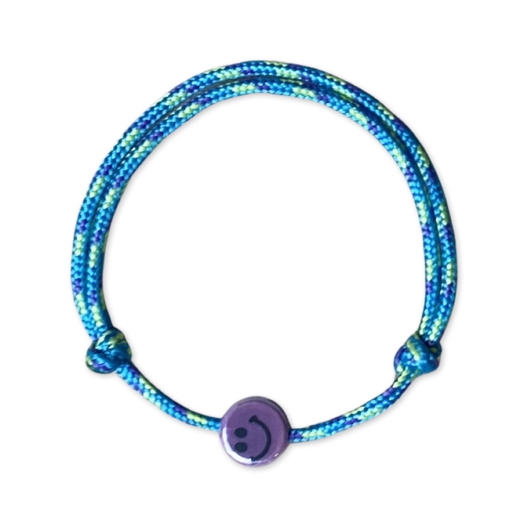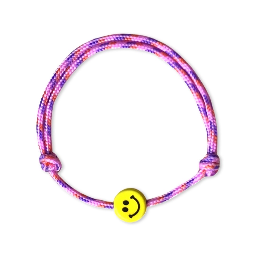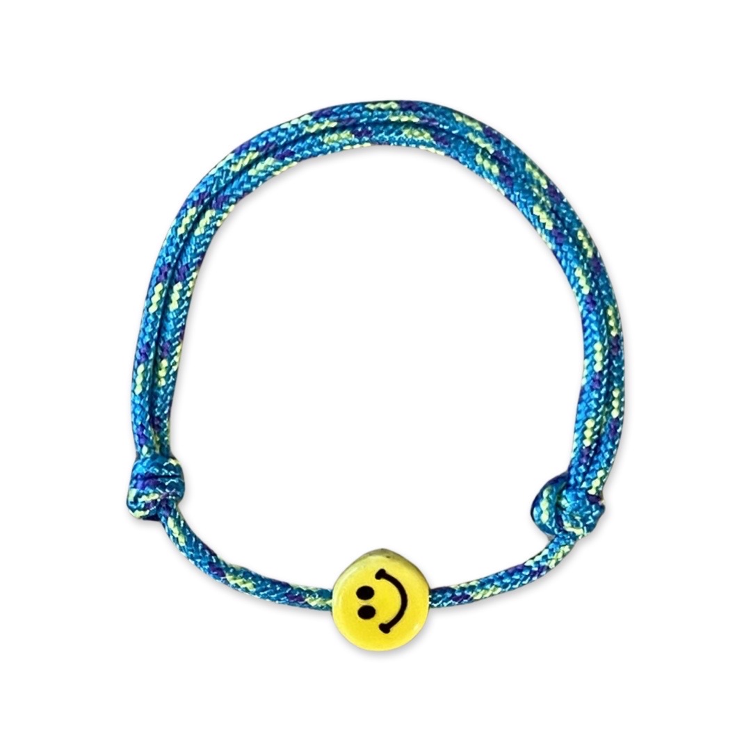 Leuke armband van gekleurd koord met een keramieke smiley bedel. De armband is verkrijgbaar in verschillende kleur opties en is verstelbaar door de 2 schuifknopen.