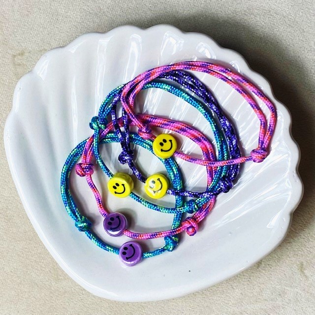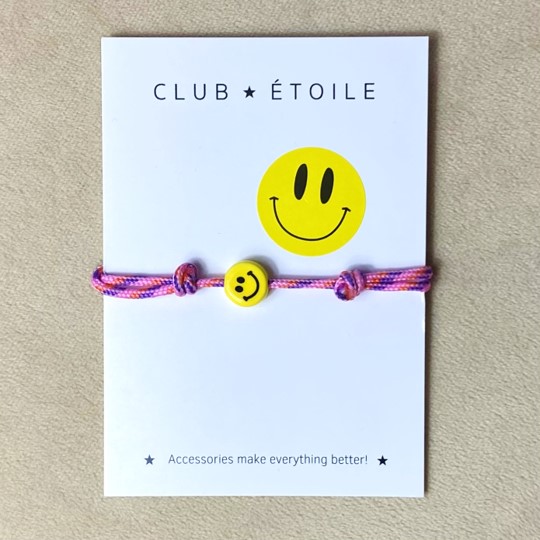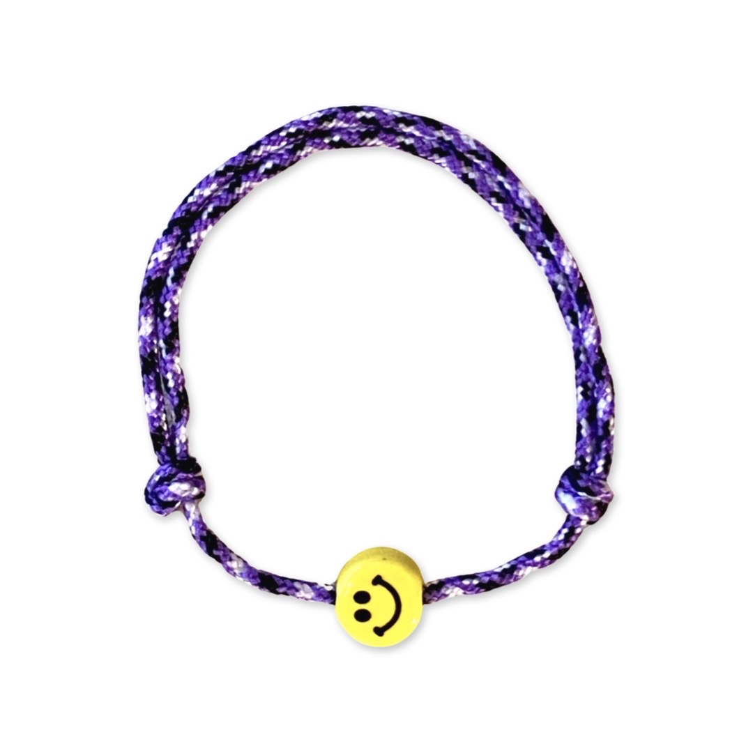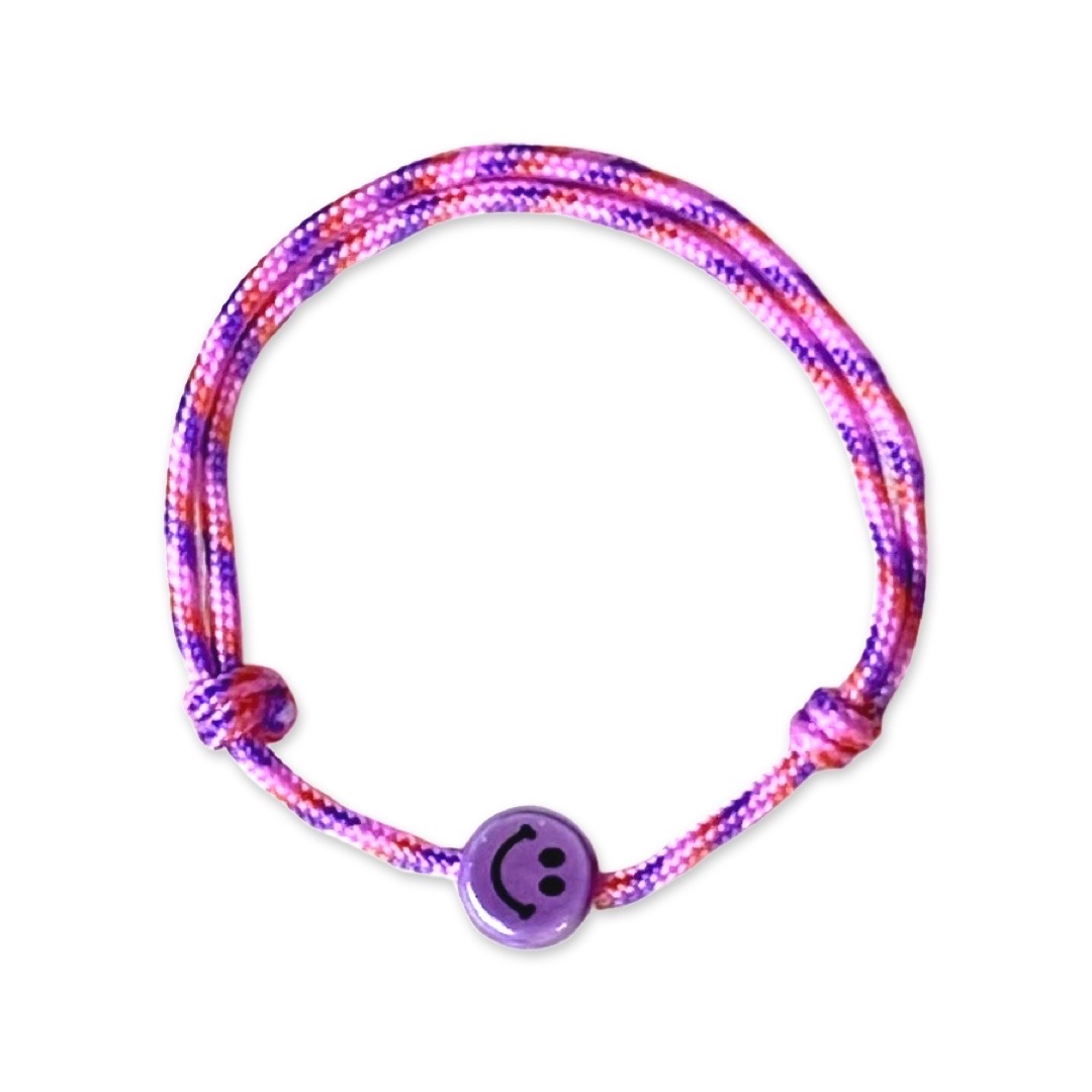 Leuke armband van gekleurd koord met een keramieke smiley bedel. De armband is verkrijgbaar in verschillende kleur opties en is verstelbaar door de 2 schuifknopen.