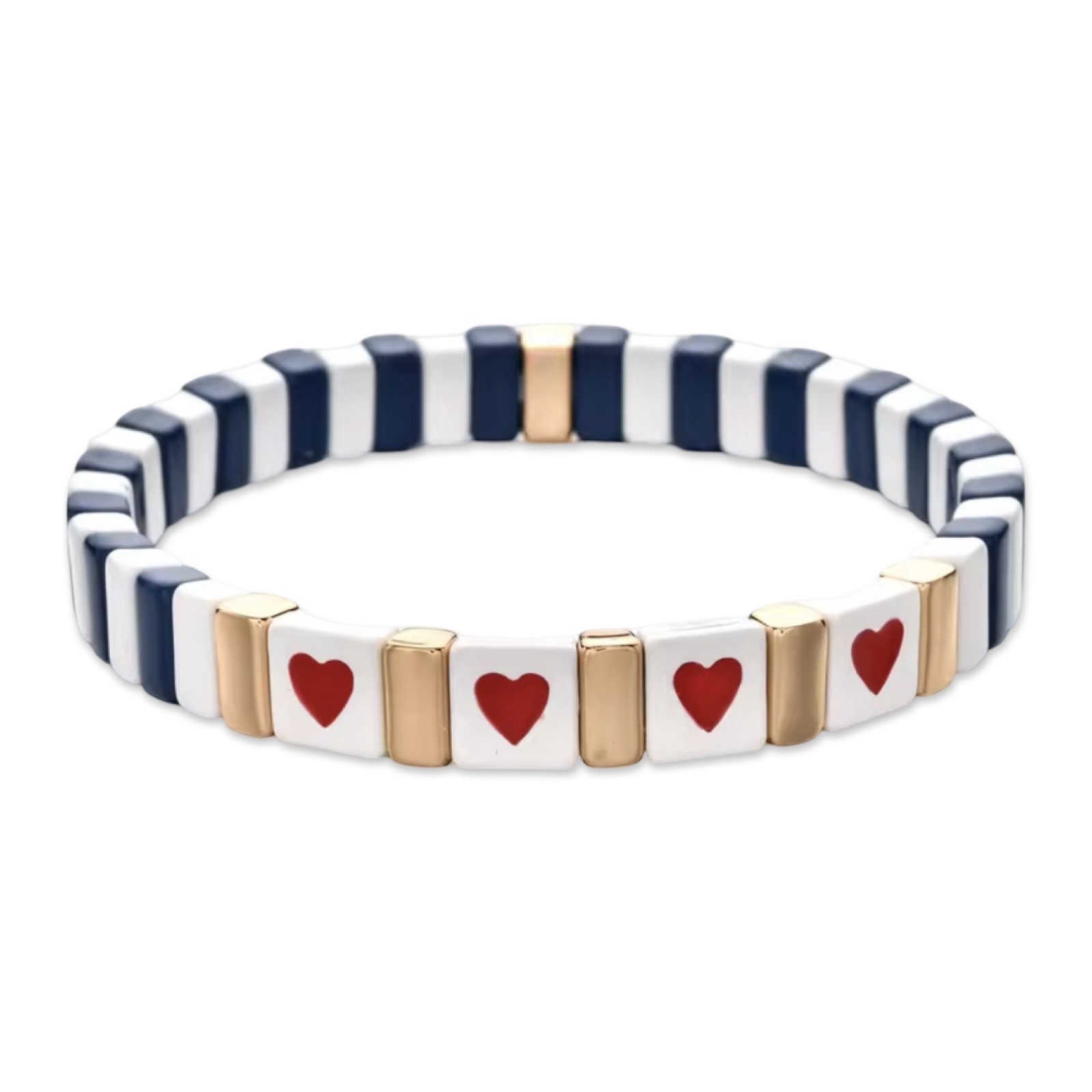 Blauw wit gestreepte armband met hartjes en gouden details gemaakt van emaille kralen, geregen op elastiek.