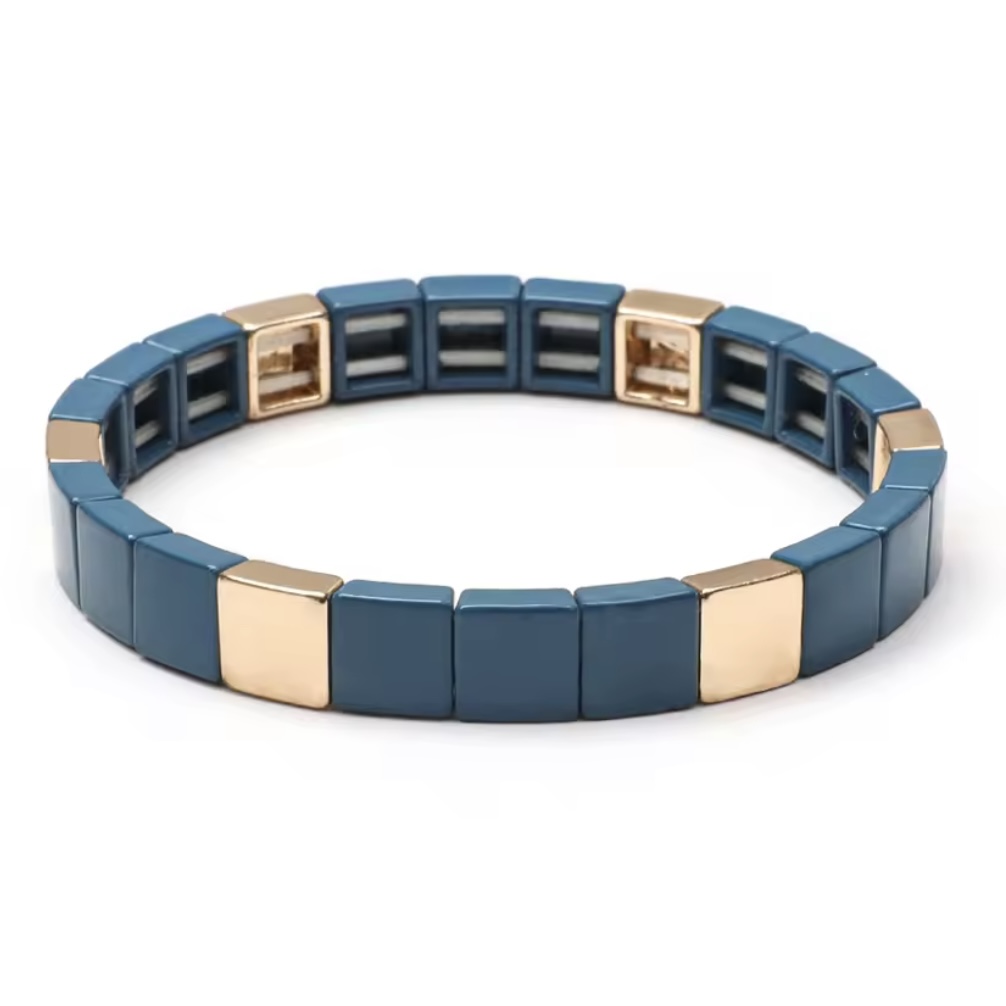 Armband van vierkante emaille kralen in teal blue met goud geregen op elastiek.