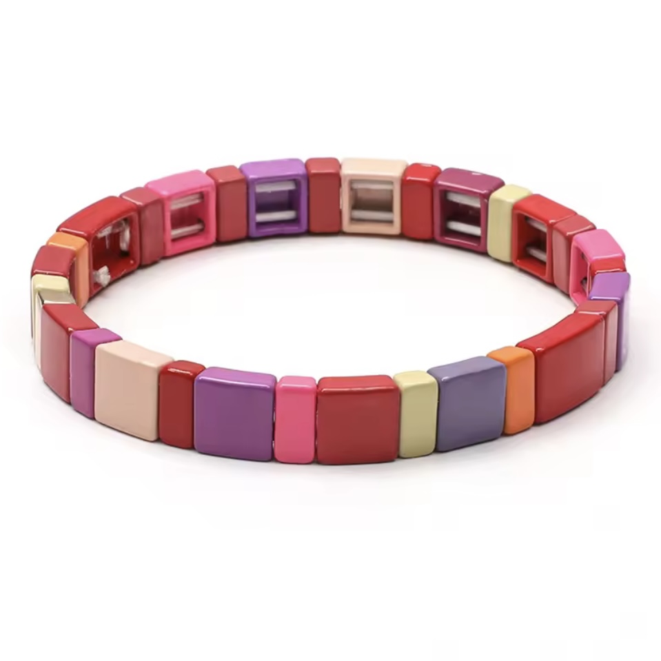 Colorblock armband in rood, paars, roze, oranje en beige gemaakt van emaille kralen geregen op elastiek.