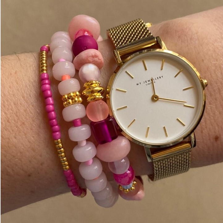 Mooie armband gemaakt van een mix van verschillende soorten kralen in roze of blauw tinten met gouden accenten. Deze armband is geregen op metaaldraad en is 19 cm lang en is ontworpen en gemaakt door Club Étoile.