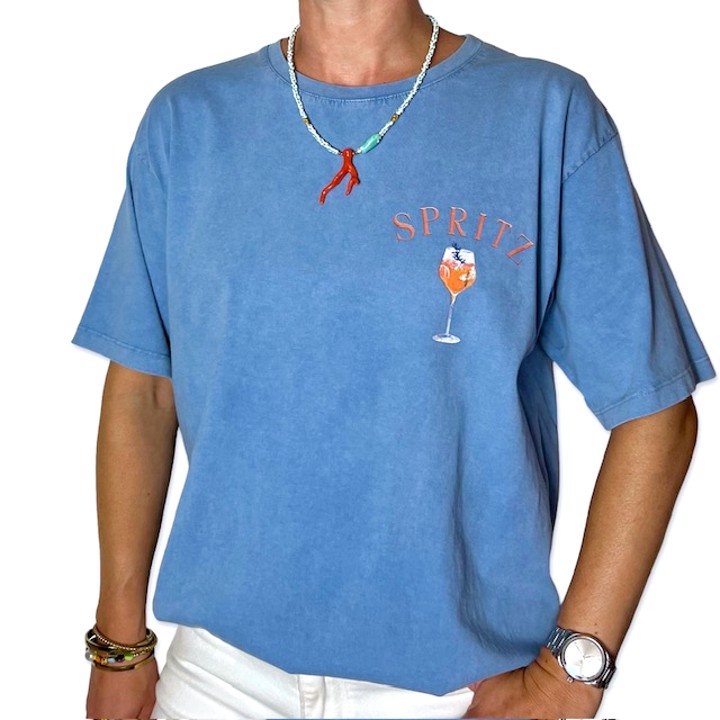 T-shirt van mooie dikke stof in het faded blue met kleine SPRITZ print op de voorkant en grote print op de achterkant.