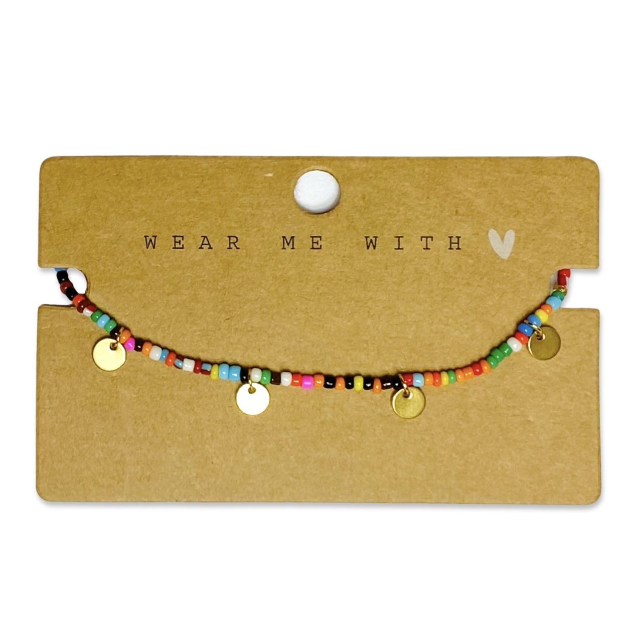 Roestvrij stalen enkelbandje met gekleurde rocaille kralen en hangende muntjes. Het enkelbandje is 27 cm lang en nog 5 cm te verstellen.