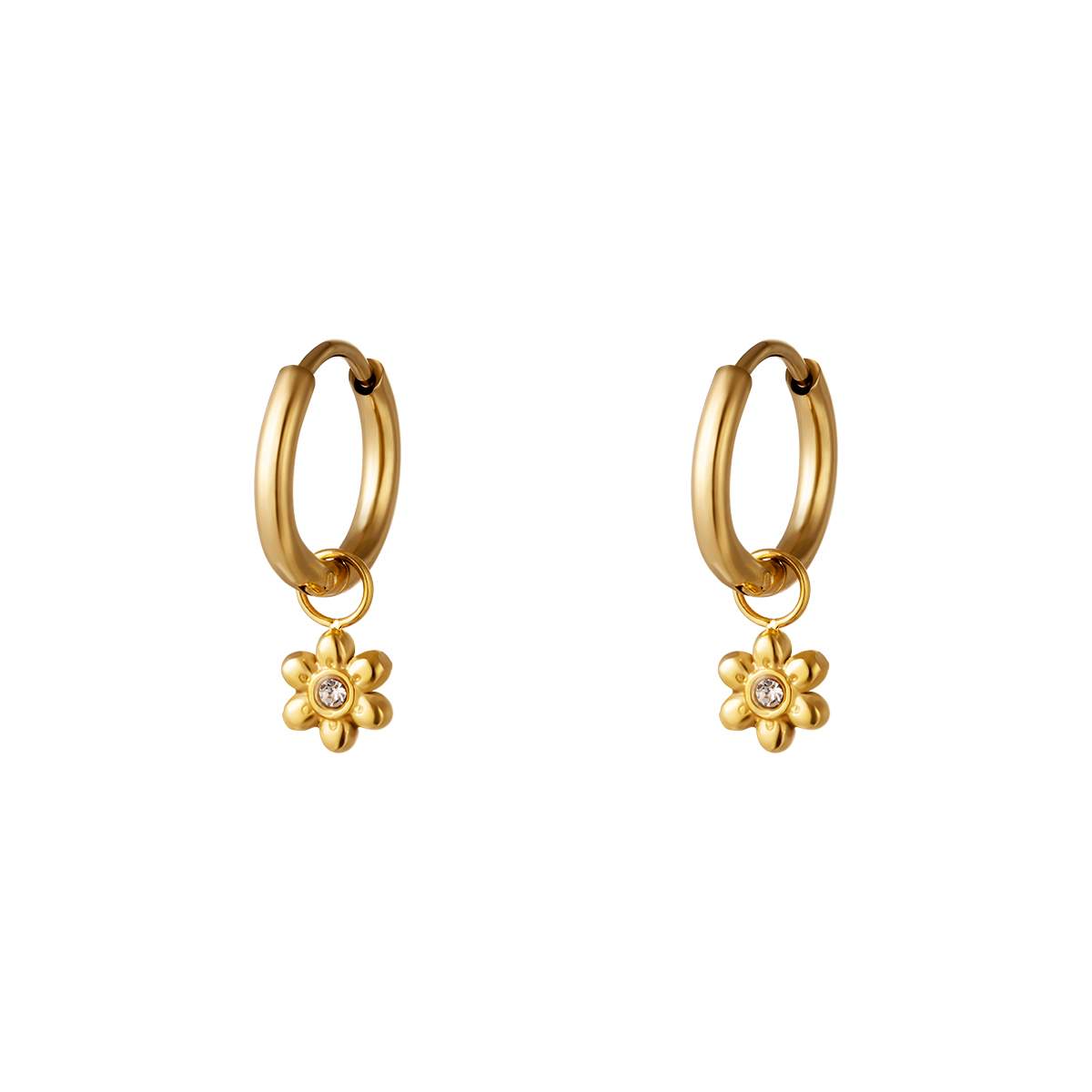 Gouden roestvrijstalen oorringen met een bedel in de vorm van een bloem met een zirkonium steentje. Perfect om te mix ‘n matchen.
